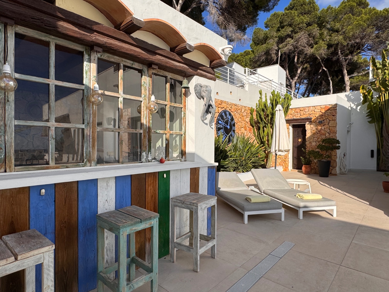 Esta villa recientemente renovada cuenta con 4 dormitorios, 5 baños, una amplia terraza, piscina privada, bar exterior y garaje para 2 coches. La vivienda está diseñada con grandes ventanales que aportan abundante luz natural y ofrecen espectaculares vistas al mar desde todas las estancias.