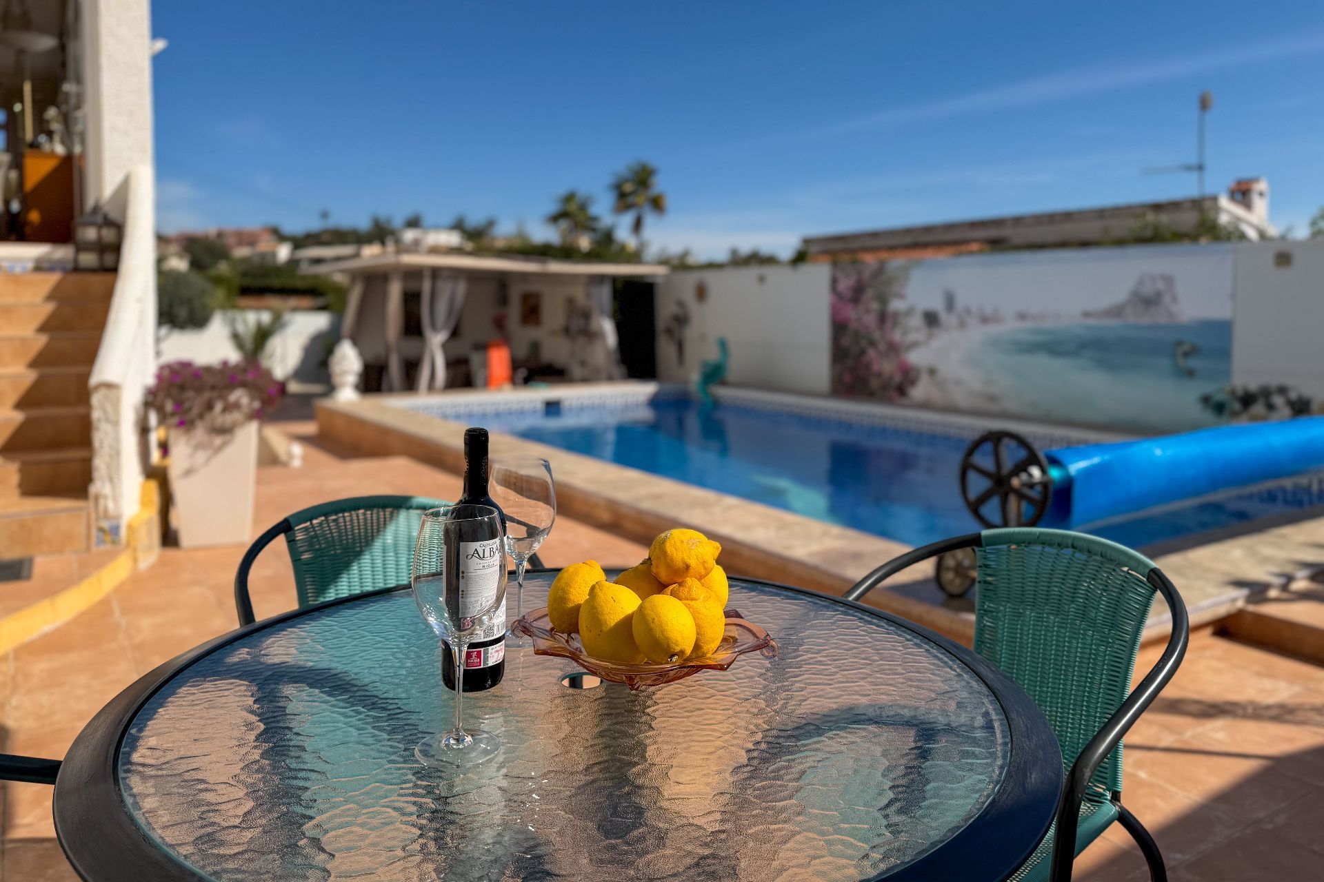 The outdoor area is a true Mediterranean retreat, featuring a private swimming pool with outdoor shower, shaded areas under a covered porch, and a low-maintenance garden with lemon trees, palm trees and other native plants — ideal for relaxing, entertaining and enjoying the Costa Blanca climate.